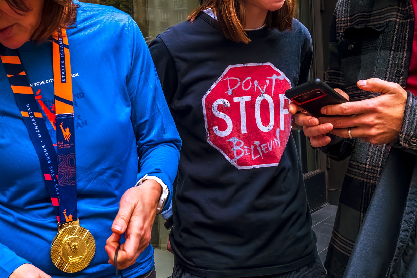 The timing couldn’t have been better. My visit lined up with the New York City Marathon, which turned the streets into an emotional spectacle. Runners digging deep, spectators leaning out over barricades chanting and drinking, handmade signs, laughter, tears it was a dream scenario for New York Street Photography. You didn’t need to search for moments; they quite literally came charging straight at you.
